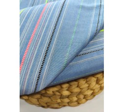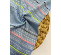 TEJIDO DE ALGODÓN AZUL JEANS, CON RAYAS HORIZONTALES RESPECTO AL ORILLO DE LA TELA. LLEVA RAYAS ENTREMEZCLADAS EN ROSA, AMARILLO Y VERDE FLÚOR, LO...