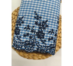 TELA DE VICHY EN AZUL Y BLANCO, DE 6MM DE TAMAÑO, BORDADO EN SUS ORILLOS. EN UNO, LLEVA UNA CENEFA DE 18CM DE ANCHO, CON FLORES EN AZUL MARINO, Y...