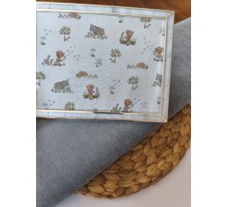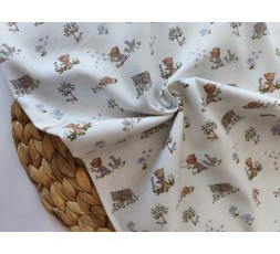 TEJIDO DE ESPIGUILLA DE FONDO BLANCO ROTO CON ANIMALES, EN MARRÓN Y GRIS. EL DIBUJO MÁS GRANDE MIDE 30MM. ES UNA TELA SUAVE AL TACTO Y CÁLIDA. SU REVÉS ES LISO. TIENE 145CM DE ANCHO. GRAMAJE 155G/M2.
