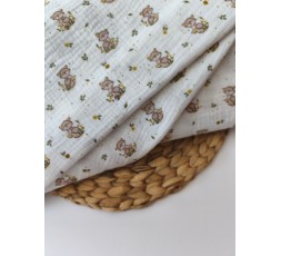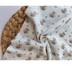 BAMBULA DE ALGODÓN EN BLANCO ROTO CON ZORRITOS EN MARRÓN Y DETALLES EN OCRE Y VERDE. COMO ES PROPIO DEL TEJIDO TIENE UN LIGERO EFECTO ARRUGADO. ES UNA TELA DE TACTO SUAVE MUY AGRADABLE, CÁLIDA, FRESCA Y TRANSPIRABLE. TIENE 145CM DE ANCHO. GRAMAJE 112G/M2.