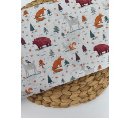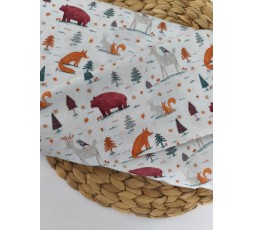 TEJIDO DE ALGODÓN BLANCO, ESTAMPADO CON ANIMALES SALVAJES EN NARANJA, PIEDRA Y VERDE. ES UNA TELA TEJIDA, DE ASPECTO SIMILAR AL LINO. ES SUAVE Y...