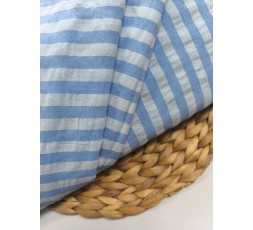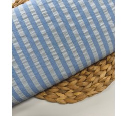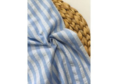 TEJIDO OXFORD, A RAYAS VERTICALES RESPECTO AL ORILLO DE LA TELA, COMBINANDO COLOR AZUL Y BLANCO. ES UNA TELA FRESCA Y LIGERA, CON UNA CAÍDA Y UN MOVIMIENTO PRECIOSO, TÍPICO DEL OXFORD. PARECE ARRUGADO Y DE ASPECTO RÚSTICO. SU REVÉS ES ESTAMPADO TAMBIÉN. TIENE 145CM DE ANCHO. GRAMAJE 110GR/M2.