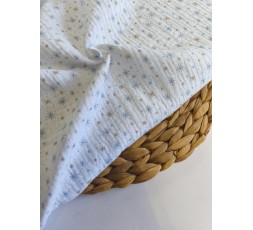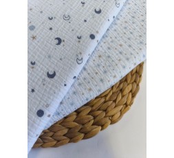 MUSELINA DE ALGODÓN. ES UN TEJIDO SIMILAR A LAS GASA O BAMBULA, ESTAMPADO CON ESTRELLAS EN VARIOS TAMAÑOS, EN TONOS AZULES. CON UNA TEJEDURÍA FINA, LIGERA Y VAPOROSA. DE ASPECTO RÚSTICO Y SEMIARRUGADO, ES UN TEJIDO CARACTERÍSTICO, YA QUE EN INVIERNO APORTA CALIDEZ, Y EN VERANO DA SENSACIÓN DE FRESCURA AL BEBÉ. TIENE 135CM DE ANCHO. GRAMAJE 128GR/M2.