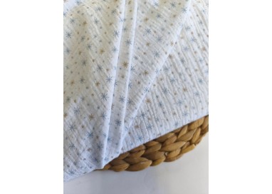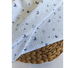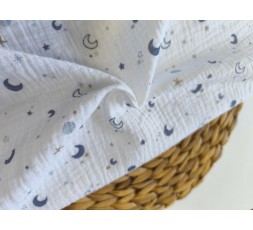 MUSELINA DE ALGODÓN. ES UN TEJIDO SIMILAR A LAS GASA O BAMBULA, DIBUJADO CON PEQUEÑAS LUNAS EN COLOR AZUL. CON UNA TEJEDURÍA FINA, LIGERA Y VAPOROSA. DE ASPECTO RÚSTICO Y SEMIARRUGADO, ES UN TEJIDO CARACTERÍSTICO, YA QUE EN INVIERNO APORTA CALIDEZ, Y EN VERANO DA SENSACIÓN DE FRESCURA AL BEBÉ. TIENE 135CM DE ANCHO. GRAMAJE 128GR/M2.
