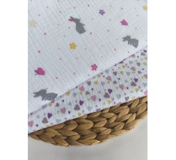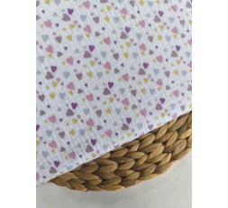 MUSELINA DE ALGODÓN. ES UN TEJIDO SIMILAR A LAS GASA O BAMBULA, DIBUJADO CON PEQUEÑAS CORAZONES EN COLOR MALVA. CON UNA TEJEDURÍA FINA, LIGERA Y VAPOROSA. DE ASPECTO RÚSTICO Y SEMIARRUGADO, ES UN TEJIDO CARACTERÍSTICO, YA QUE EN INVIERNO APORTA CALIDEZ, Y EN VERANO DA SENSACIÓN DE FRESCURA AL BEBÉ. TIENE 135CM DE ANCHO. GRAMAJE 128GR/M2.