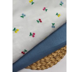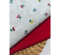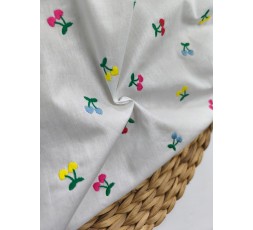 TELA DE ALGODÓN BLANCO, CON ORIGINALES RAMILLETES DE CEREZAS EN FORMA DE CORAZÓN BORDADOS DIRECTAMENTE SOBRE EL TEJIDO, EN COLORES FUERTES Y VIBRANTES. ES UNA TELA LIGERA, BLANDA Y SEMITRANSPARENTE. TIENE 150CM DE ANCHO. GRAMAJE 114GR/M2.